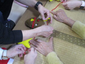 完成した作品はながーい毛糸に糸でくくり、天井から吊り下げた飾りつけとなりました。くくり作業は有志で募った利用者様と「あと少しだー!」と鼓舞しあいながら楽しく取り組んでいましたよ☆
