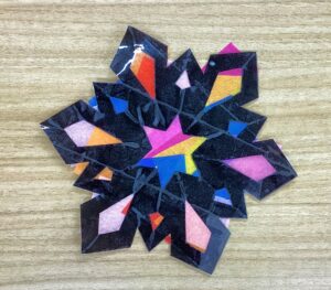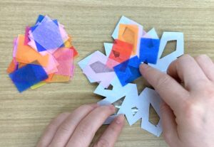 ステンドグラス風の飾りは、切り絵に透明シールを貼り、裏側にお花紙を貼ると完成です!
