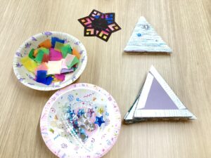 創作では毛糸のガーランドやお花紙のステンドグラス風の飾りを作りました。